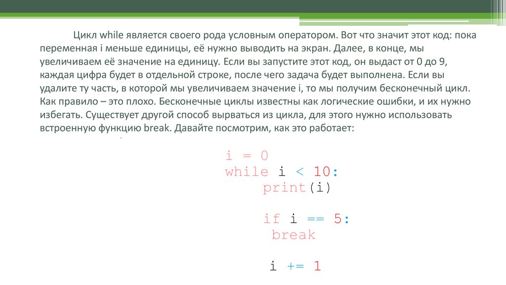 Цикл while является своего рода условным оператором. Вот что значит этот код: покапеременная i меньше единицы, её нужно выводить на экран. Далее, в конце, мы