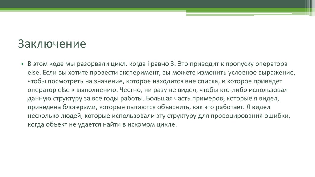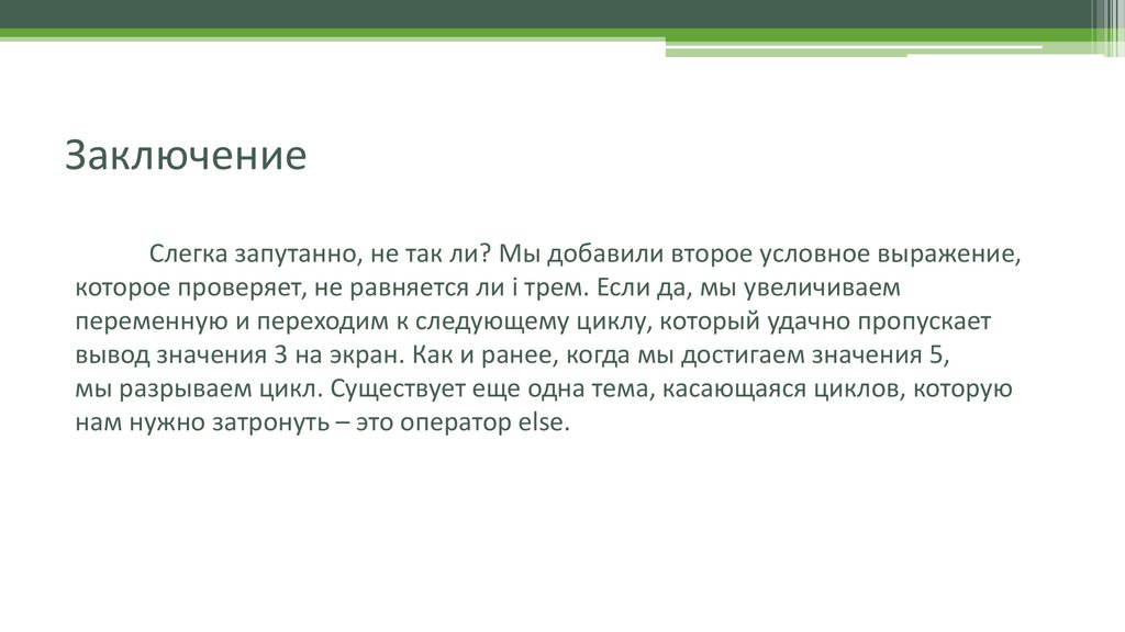 Заключение• В этом коде мы разорвали цикл, когда i равно 3. Это приводит к пропуску оператора