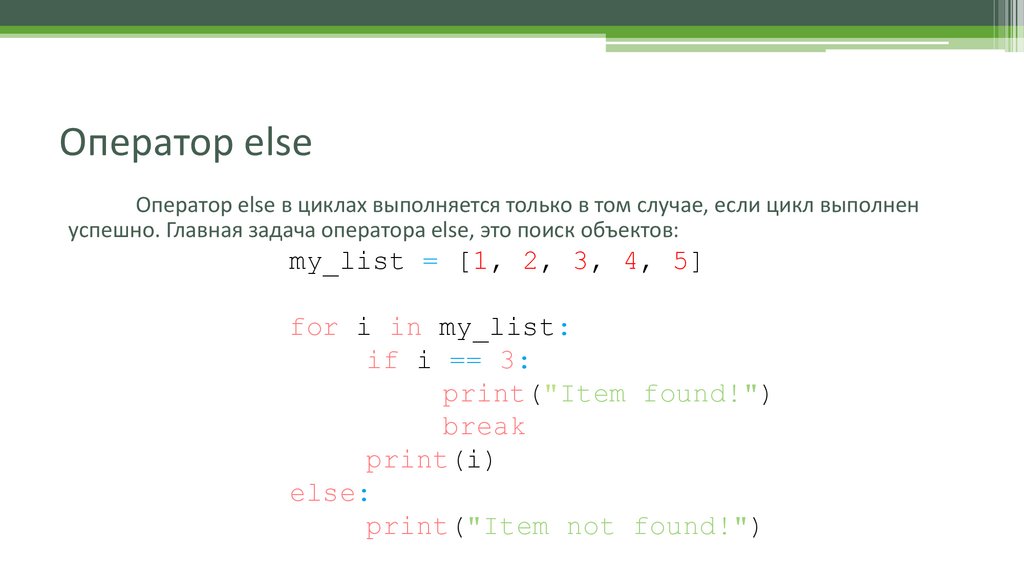 Оператор elseОператор else в циклах выполняется только в том случае, если цикл выполнен