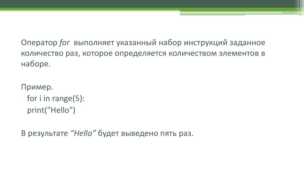 Оператор for выполняет указанный набор инструкций заданноеколичество раз, которое определяется количеством элементов в