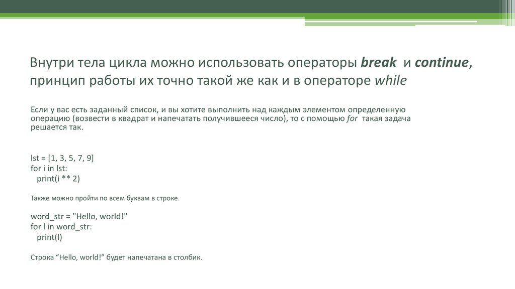 Внутри тела цикла можно использовать операторы break и continue,принцип работы их точно такой же как и в операторе while