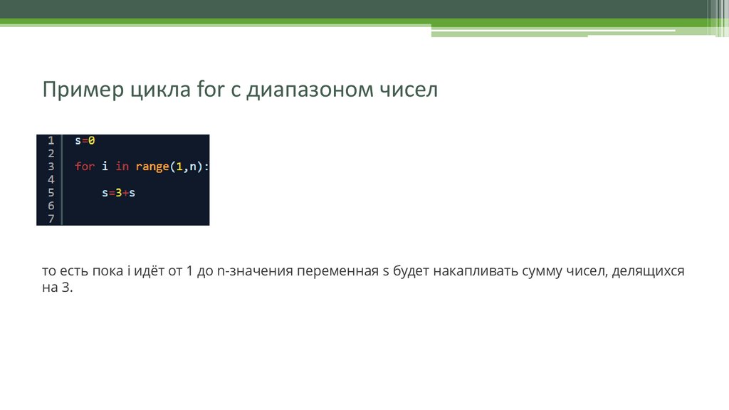 Пример цикла for с диапазоном чиселто есть пока i идёт от 1 до n-значения переменная s будет накапливать сумму чисел, делящихся