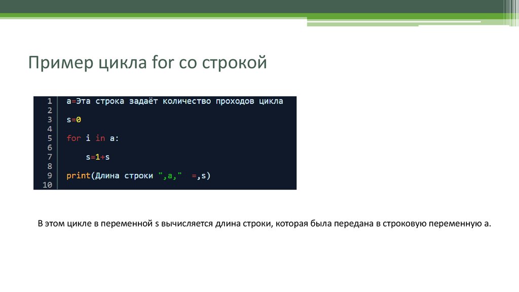 Пример цикла for со строкойВ этом цикле в переменной s вычисляется длина строки, которая была передана в строковую переменную a.