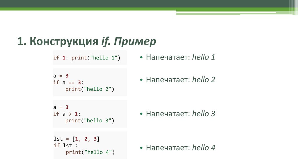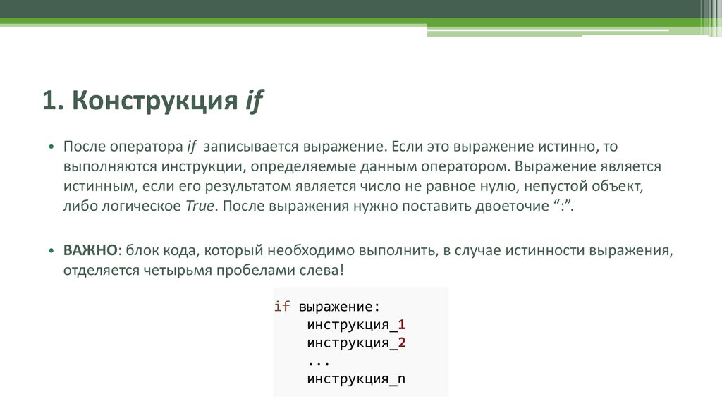 1. Конструкция if• После оператора if записывается выражение. Если это выражение истинно, то