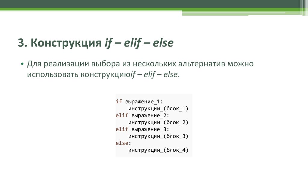3. Конструкция if – elif – else• Для реализации выбора из нескольких альтернатив можно