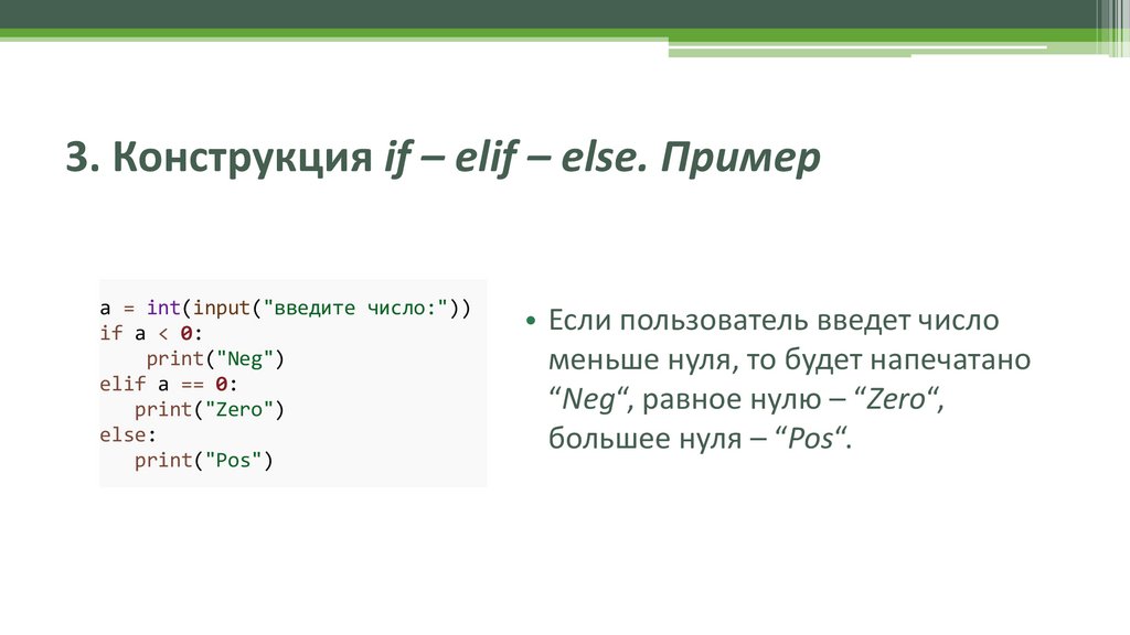 3. Конструкция if – elif – else. Примерa = int(input("введите число:"))