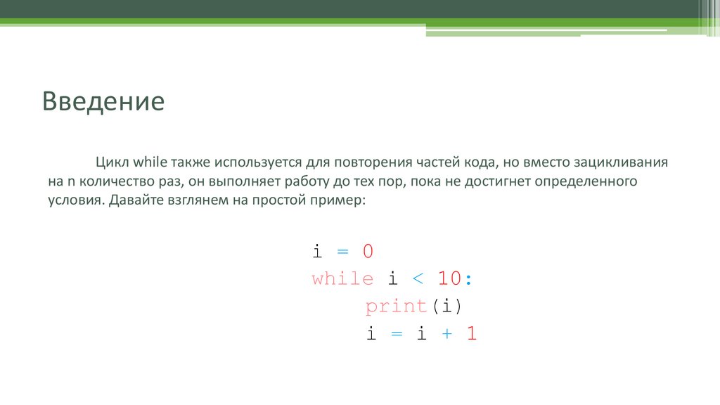 ВведениеЦикл while также используется для повторения частей кода, но вместо зацикливания