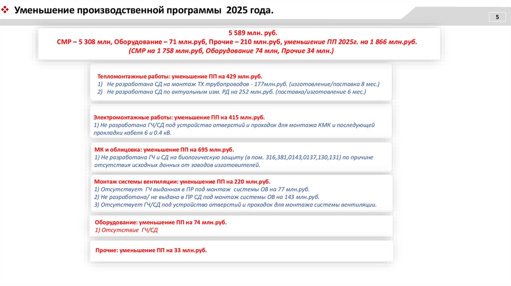 Уменьшение ПП 2025г. на сумму 1,76 млрд руб, в связи с отсутствием рабочей документации (ГЧ, СД) и разработанного механизма компенсации затрат на выполнение