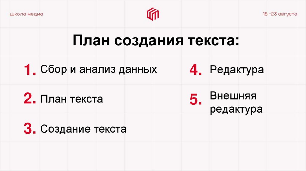 План создания текста:1. Сбор и анализ данных