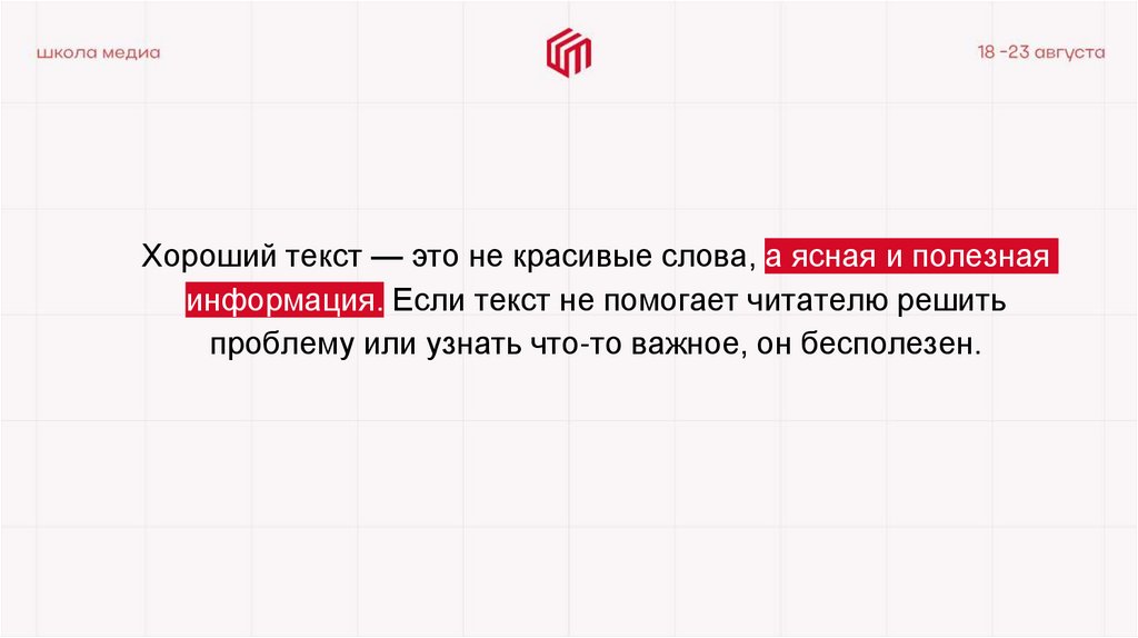 Хороший текст — это не красивые слова, а ясная и полезнаяинформация. Если текст не помогает читателю решить