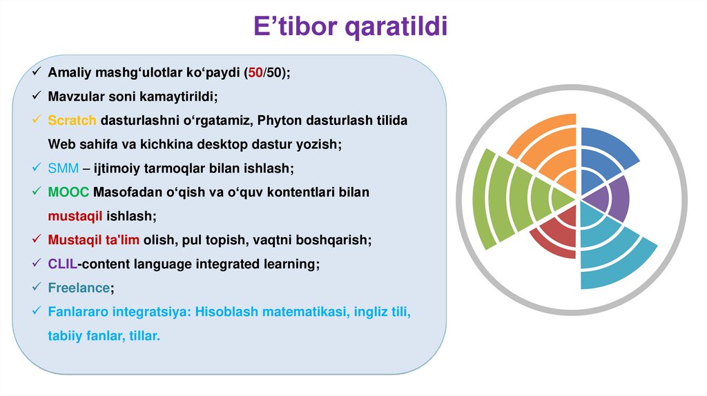 E’tibor qaratildiAmaliy mashg‘ulotlar ko‘paydi (50/50);