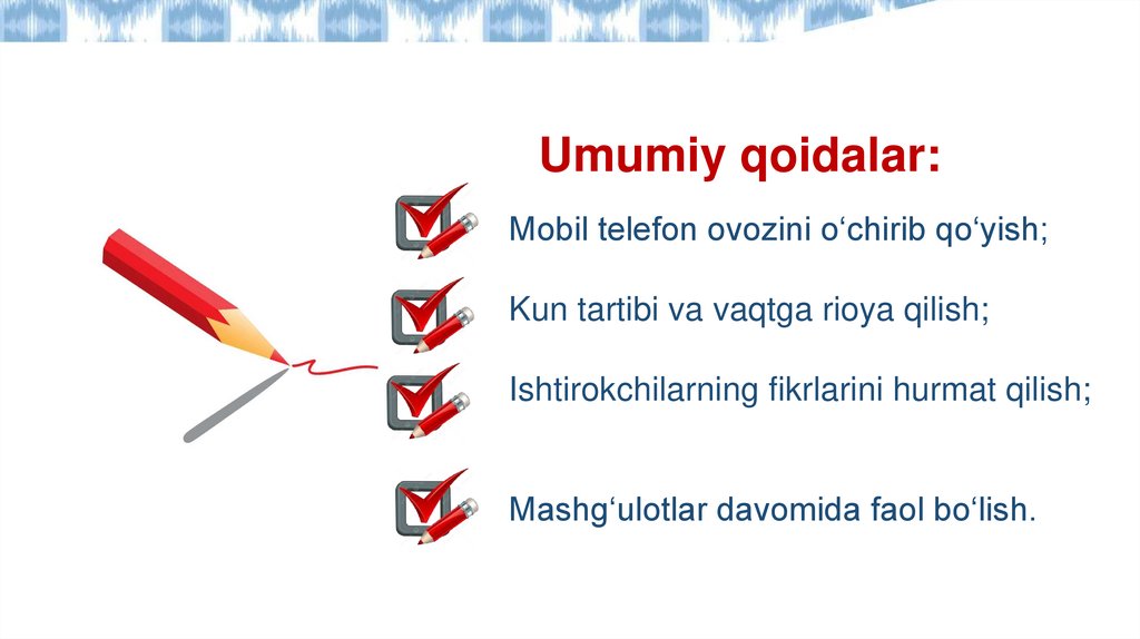 Umumiy qoidalar:Mobil telefon ovozini o‘chirib qo‘yish;