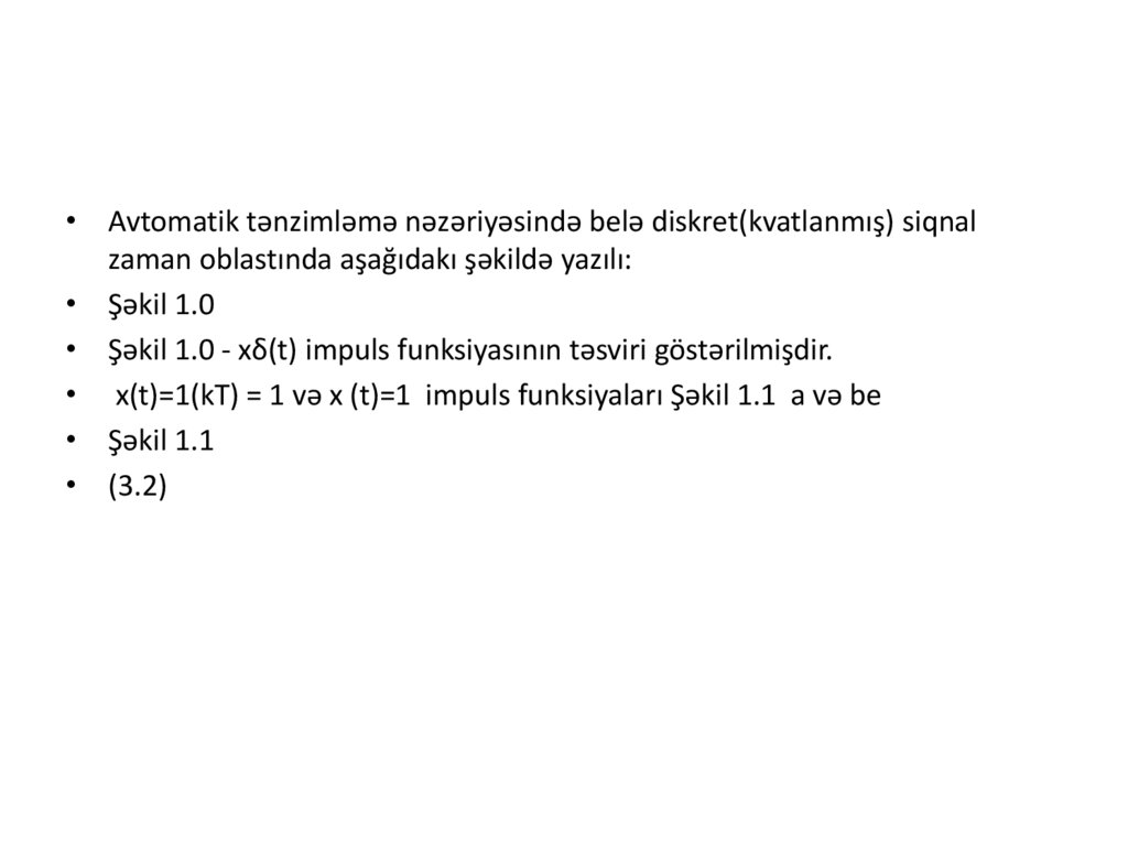 • Avtomatik tənzimləmə nəzəriyəsində belə diskret(kvatlanmış) siqnalzaman oblastında aşağıdakı şəkildə yazılı: