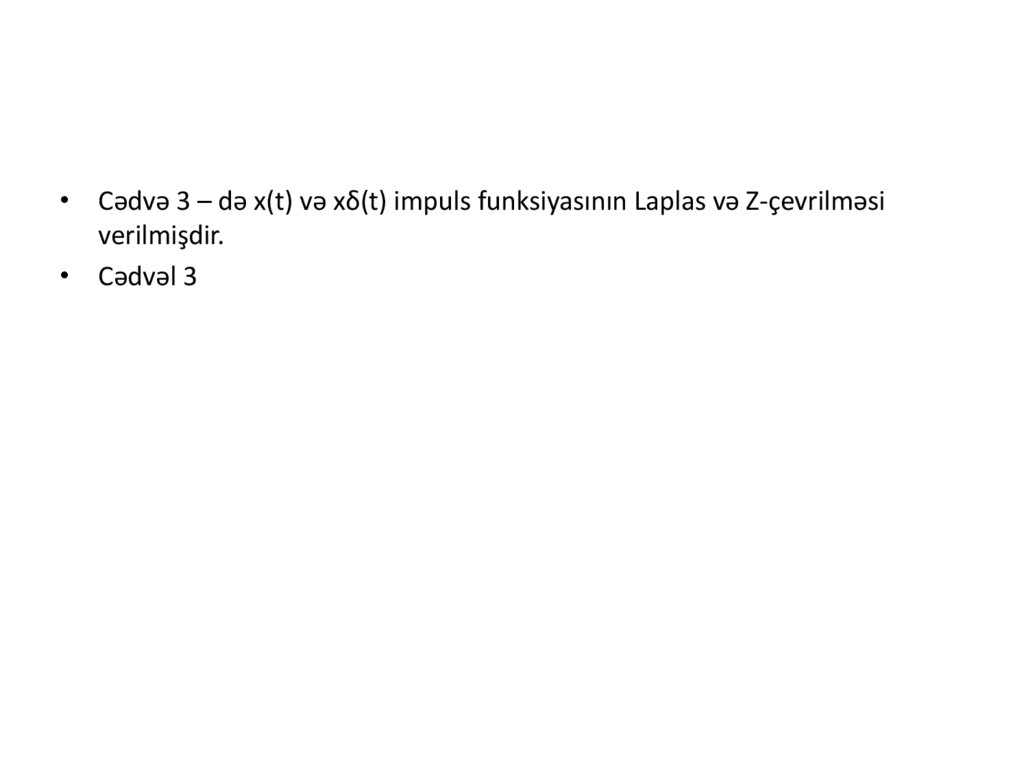 • Cədvə 3 – də x(t) və xδ(t) impuls funksiyasının Laplas və Z-çevrilməsiverilmişdir.