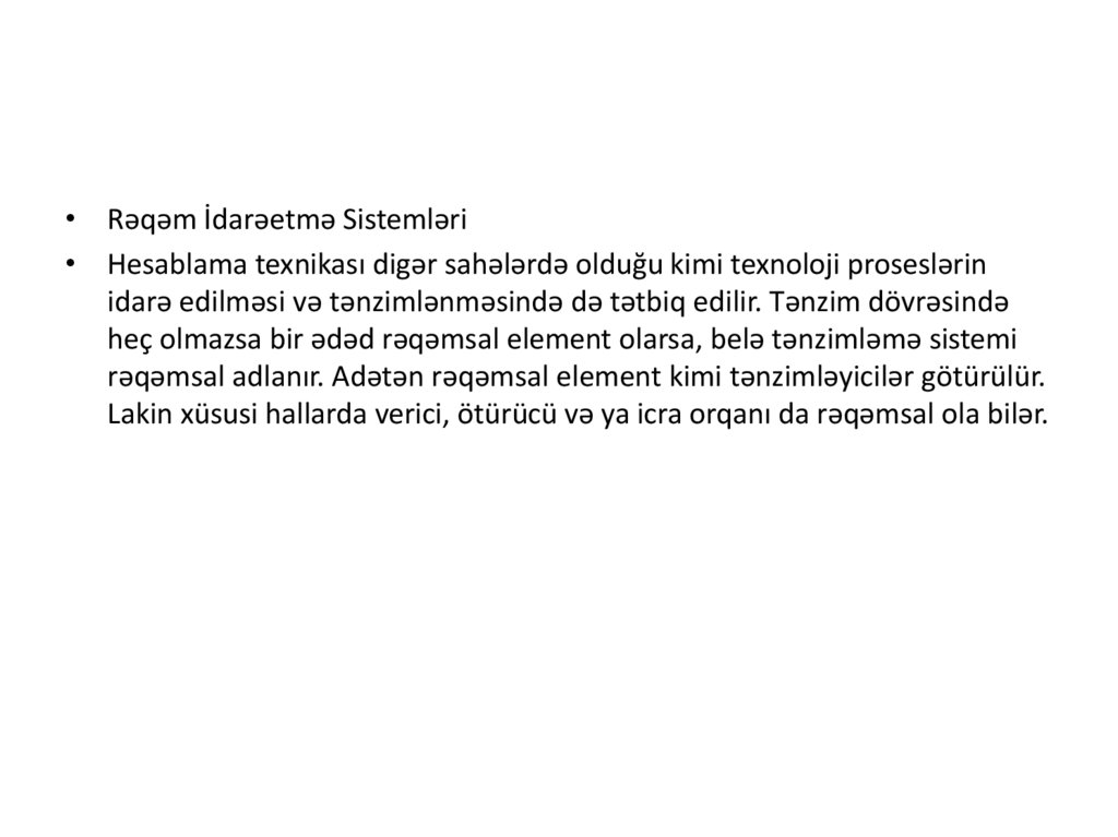 • Rəqəm İdarəetmə Sistemləri• Hesablama texnikası digər sahələrdə olduğu kimi texnoloji proseslərin
