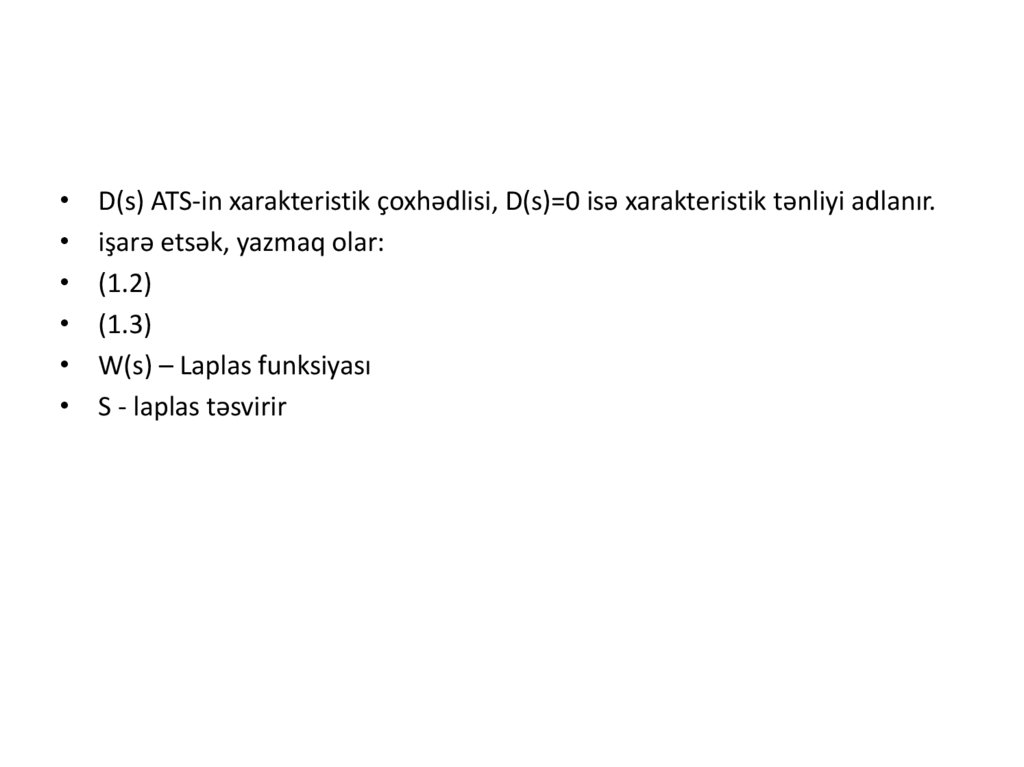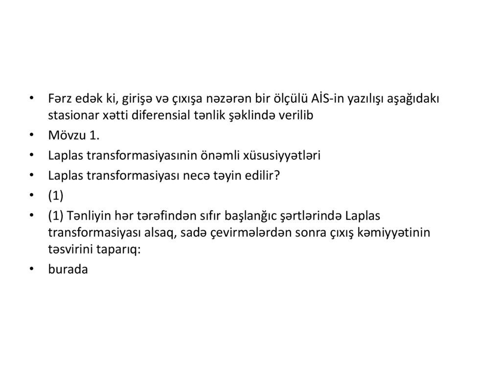 • Fərz edək ki, girişə və çıxışa nəzərən bir ölçülü AİS-in yazılışı aşağıdakıstasionar xətti diferensial tənlik şəklində verilib