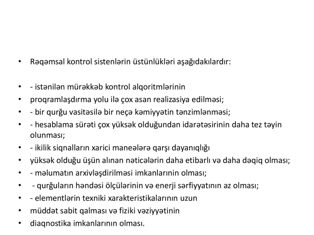• Rəqəmsal kontrol sistenlərin üstünlükləri aşağıdakılardır:- istənilən mürəkkəb kontrol alqoritmlərinin