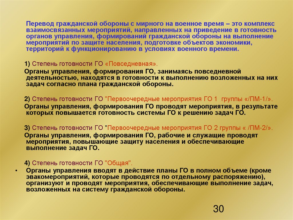 Перевод гражданской обороны с мирного на военное время – это комплексвзаимосвязанных мероприятий, направленных на приведение в готовность