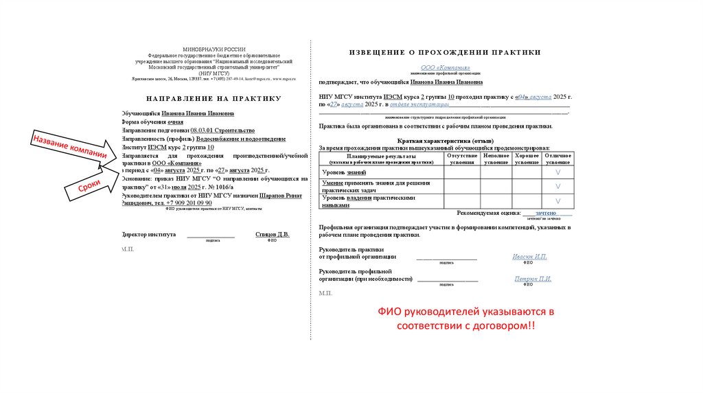 ФИО руководителя практики от НИУ МГСУ, контакты