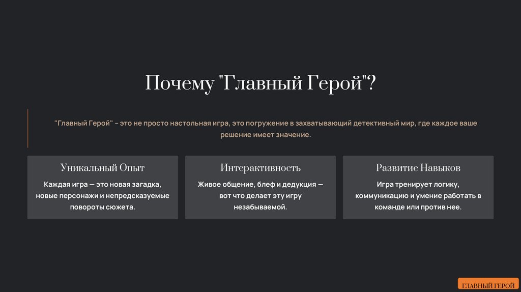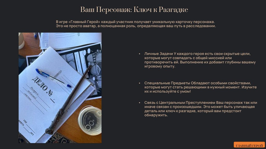 Почему "Главный Герой"?"Главный Герой" – это не просто настольная игра, это погружение в захватывающий детективный мир, где каждое ваше