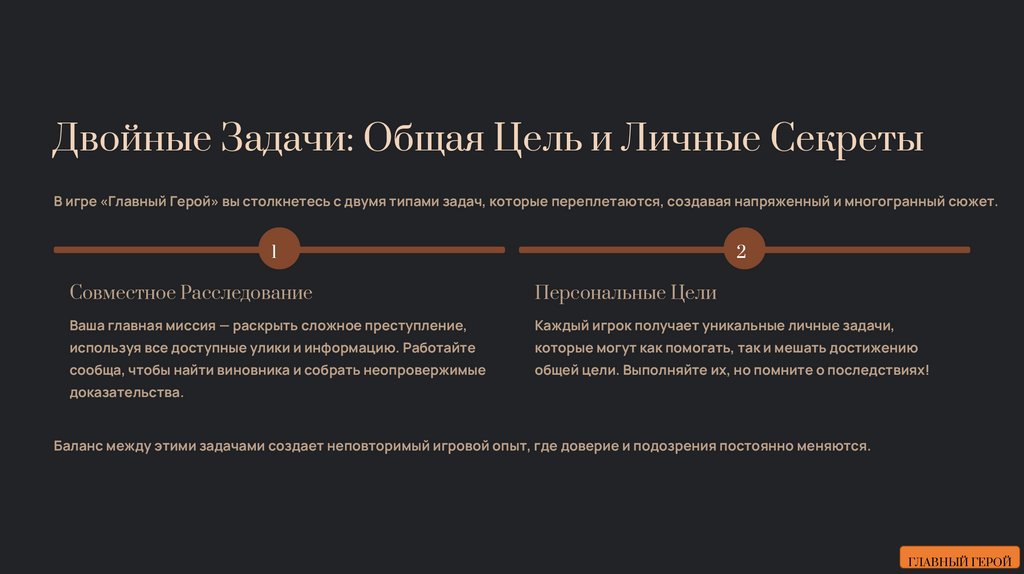 Двойные Задачи: Общая Цель и Личные СекретыВ игре «Главный Герой» вы столкнетесь с двумя типами задач, которые переплетаются, создавая напряженный и многогранный сюжет.