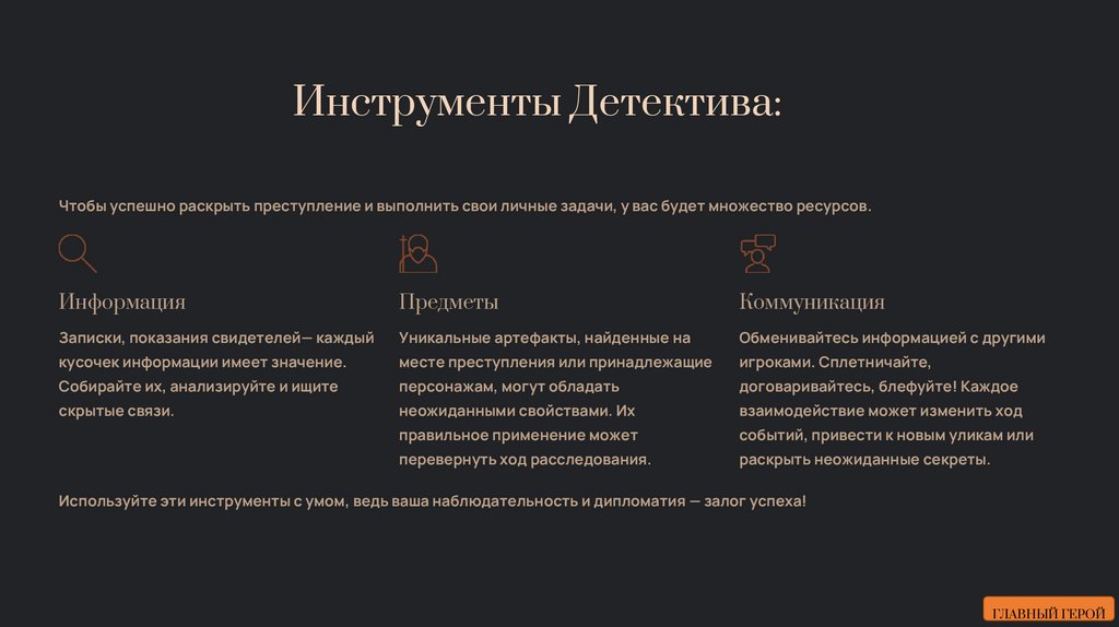 Инструменты Детектива:Чтобы успешно раскрыть преступление и выполнить свои личные задачи, у вас будет множество ресурсов.