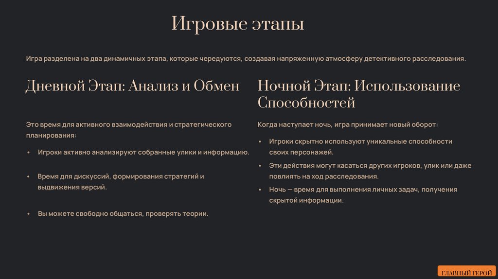 Игровые этапыИгра разделена на два динамичных этапа, которые чередуются, создавая напряженную атмосферу детективного расследования.
