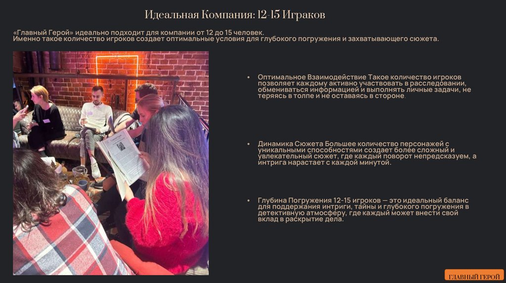 Идеальная Компания: 12-15 Играков«Главный Герой» идеально подходит для компании от 12 до 15 человек.