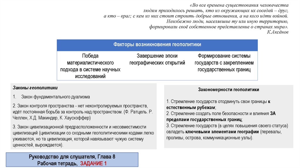идёт постоянная борьба за контроль над пространством. (Ф. Ратцель. Р.