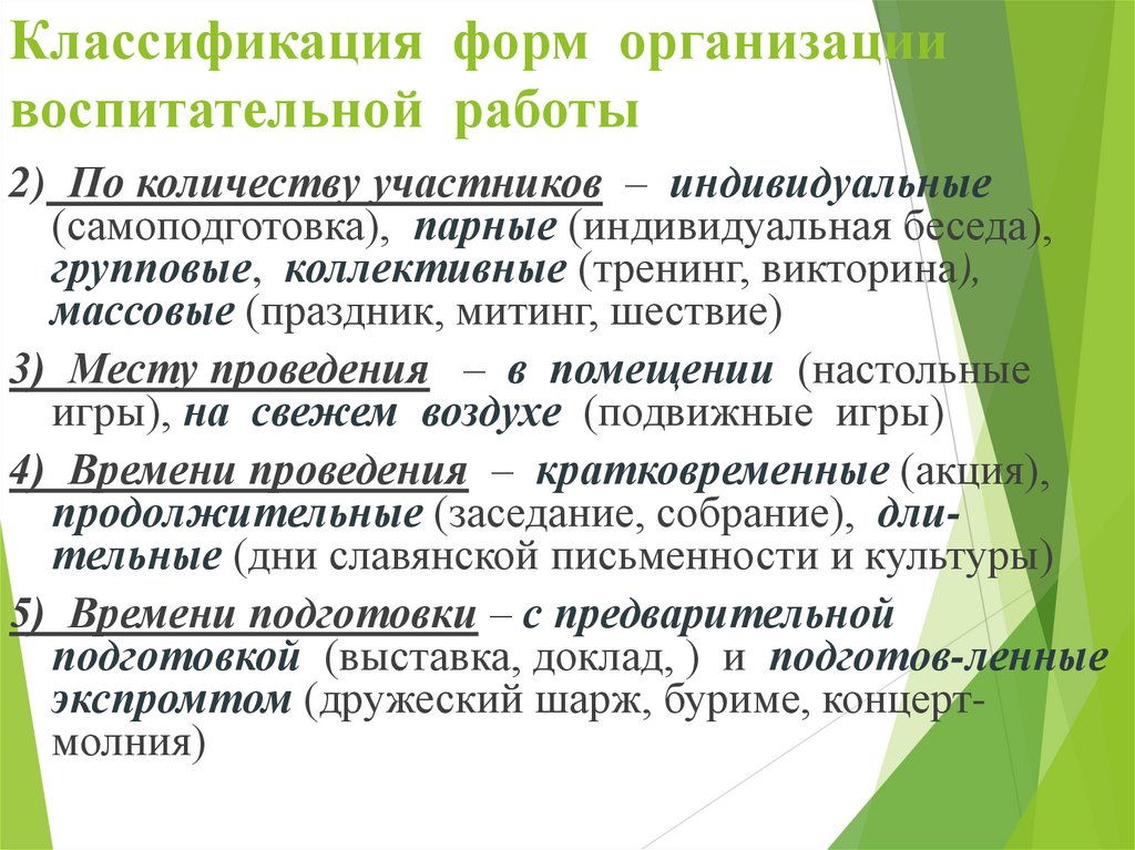 2) По количеству участников – индивидуальные(самоподготовка), парные (индивидуальная беседа),