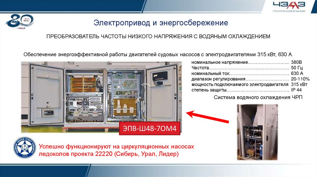 Обеспечение энергоэффективной работы двигателей судовых насосов с электродвигателями 315 кВт, 630 А.