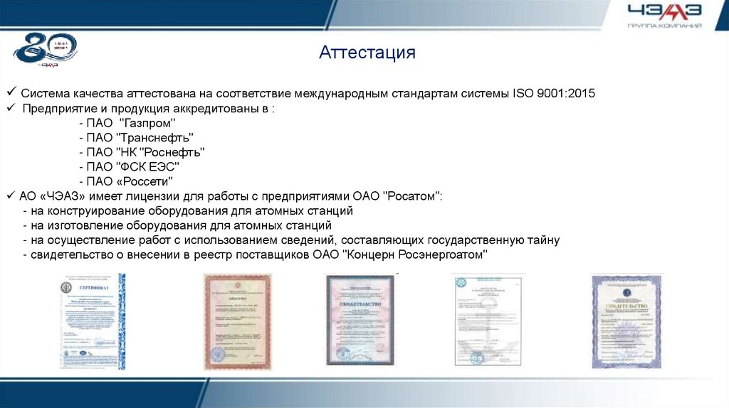 АО «ЧЭАЗ» имеет лицензии для работы с предприятиями ОАО "Росатом":