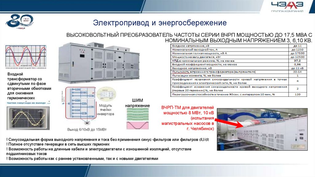 Электропривод и энергосбережениеВЫСОКОВОЛЬТНЫЙ ПРЕОБРАЗОВАТЕЛЬ ЧАСТОТЫ СЕРИИ ВЧРП МОЩНОСТЬЮ ДО 17,5 МВА С