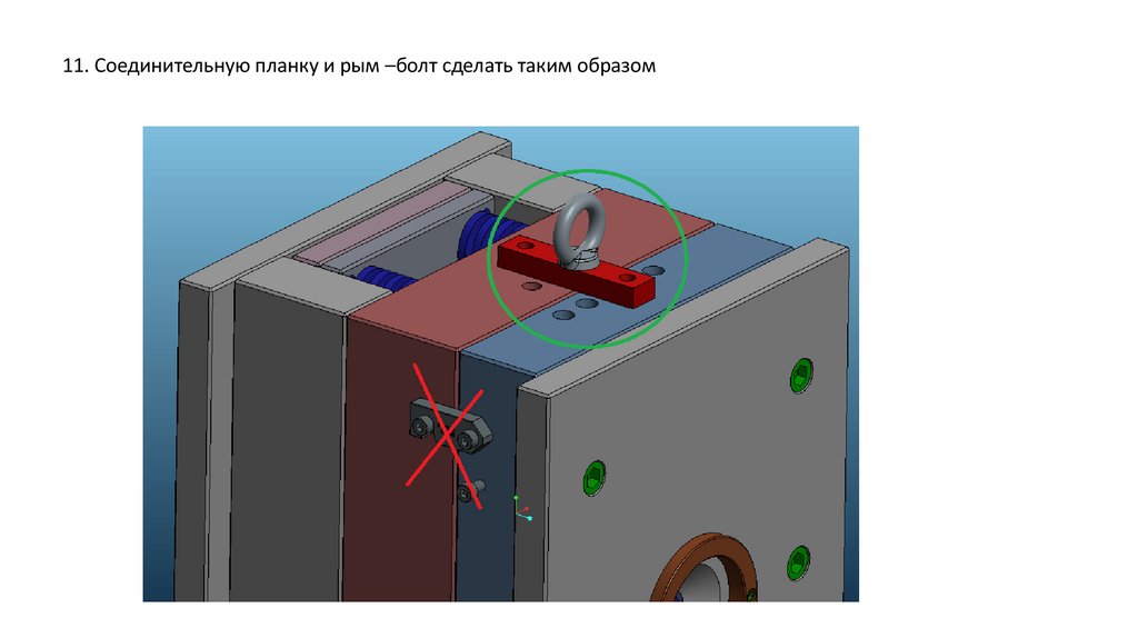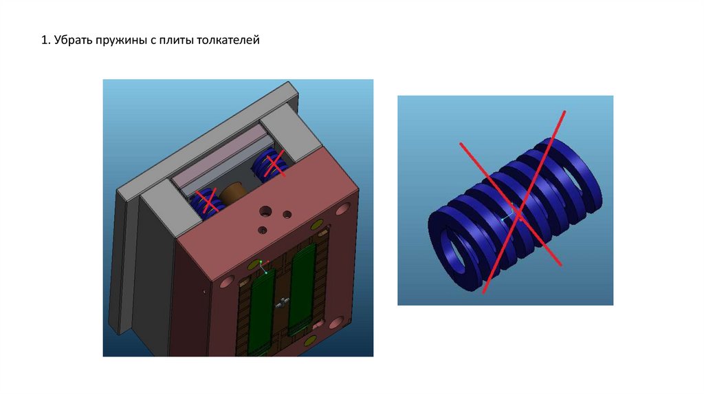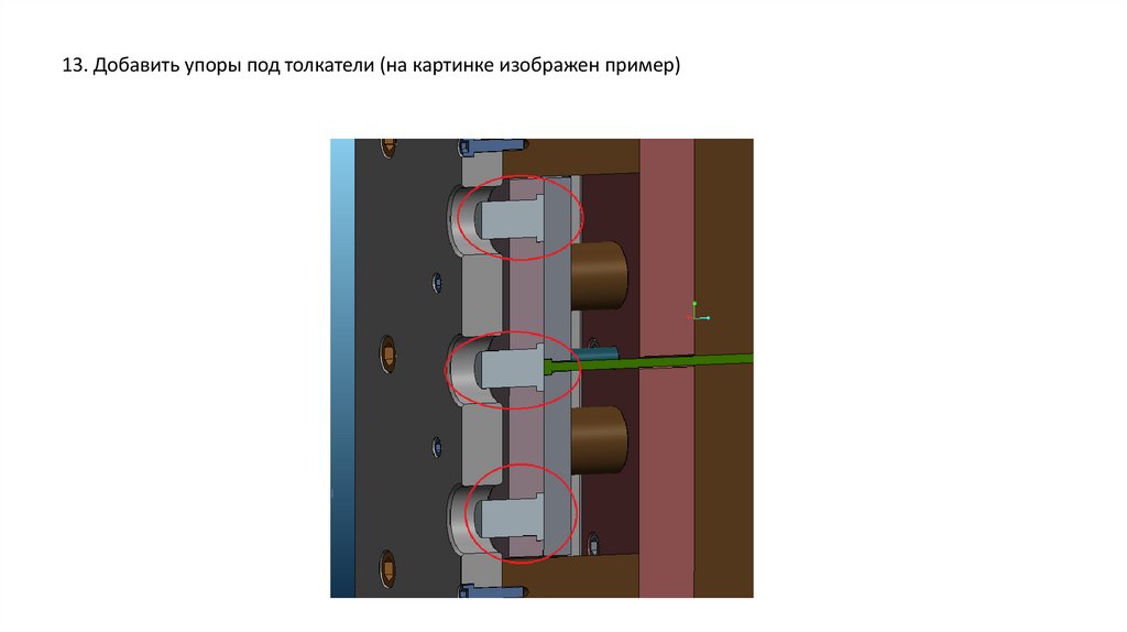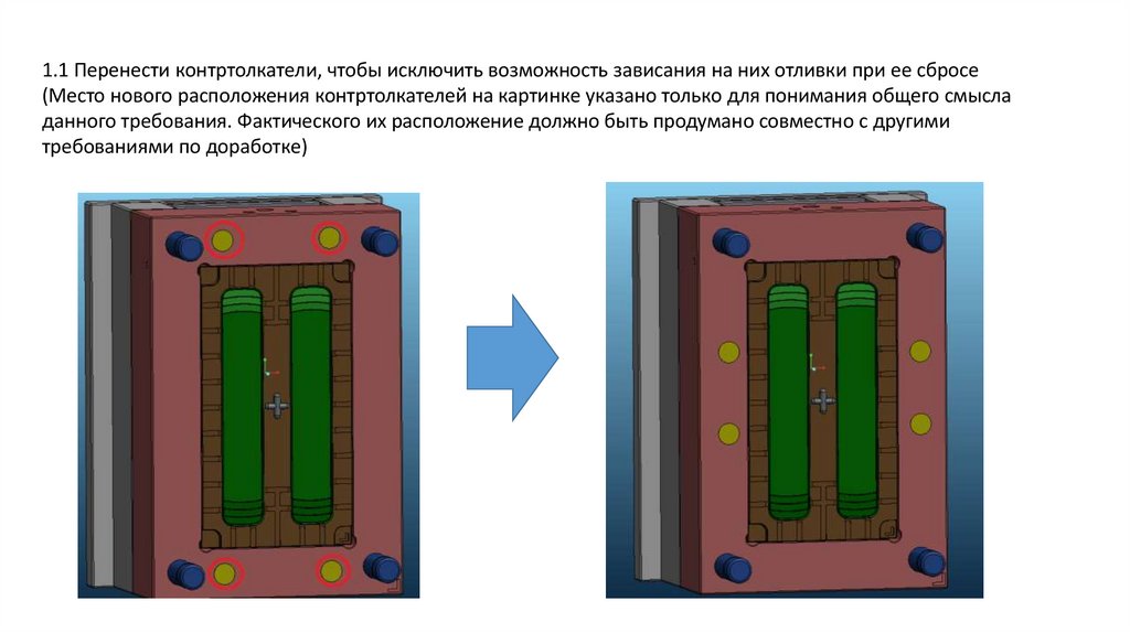 1.1 Перенести контртолкатели, чтобы исключить возможность зависания на них отливки при ее сбросе(Место нового расположения контртолкателей на картинке указано только для понимания общего смысла