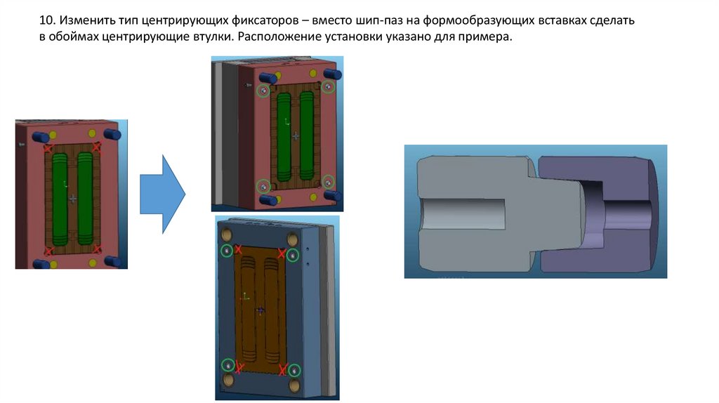 10. Изменить тип центрирующих фиксаторов – вместо шип-паз на формообразующих вставках сделатьв обоймах центрирующие втулки. Расположение установки указано для примера.