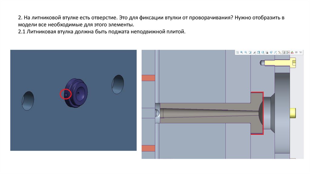 2. На литниковой втулке есть отверстие. Это для фиксации втулки от проворачивания? Нужно отобразить вмодели все необходимые для этого элементы.