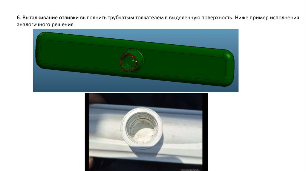 6. Выталкивание отливки выполнить трубчатым толкателем в выделенную поверхность. Ниже пример исполненияаналогичного решения.