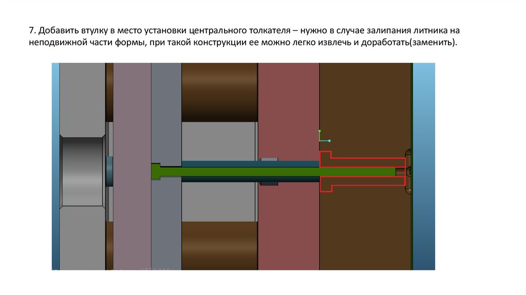 7. Добавить втулку в место установки центрального толкателя – нужно в случае залипания литника нанеподвижной части формы, при такой конструкции ее можно легко извлечь и доработать(заменить).