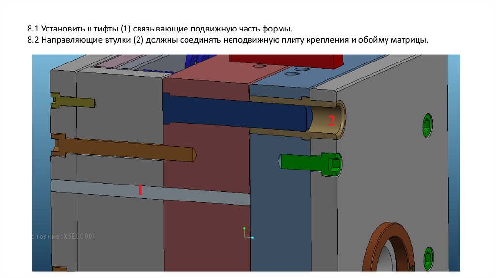 8.1 Установить штифты (1) связывающие подвижную часть формы.8.2 Направляющие втулки (2) должны соединять неподвижную плиту крепления и обойму матрицы.