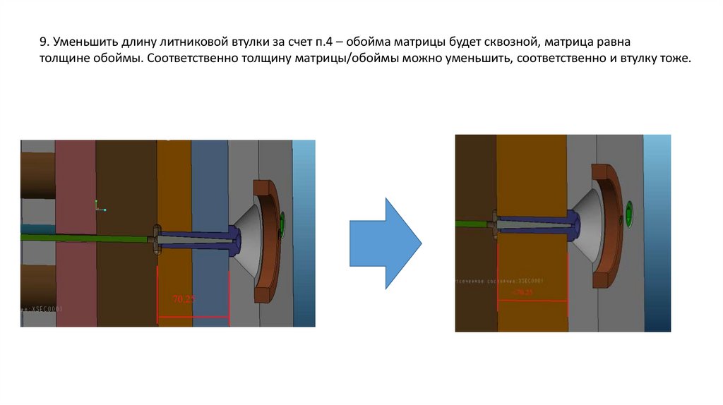 9. Уменьшить длину литниковой втулки за счет п.4 – обойма матрицы будет сквозной, матрица равнатолщине обоймы. Соответственно толщину матрицы/обоймы можно уменьшить, соответственно и втулку тоже.
