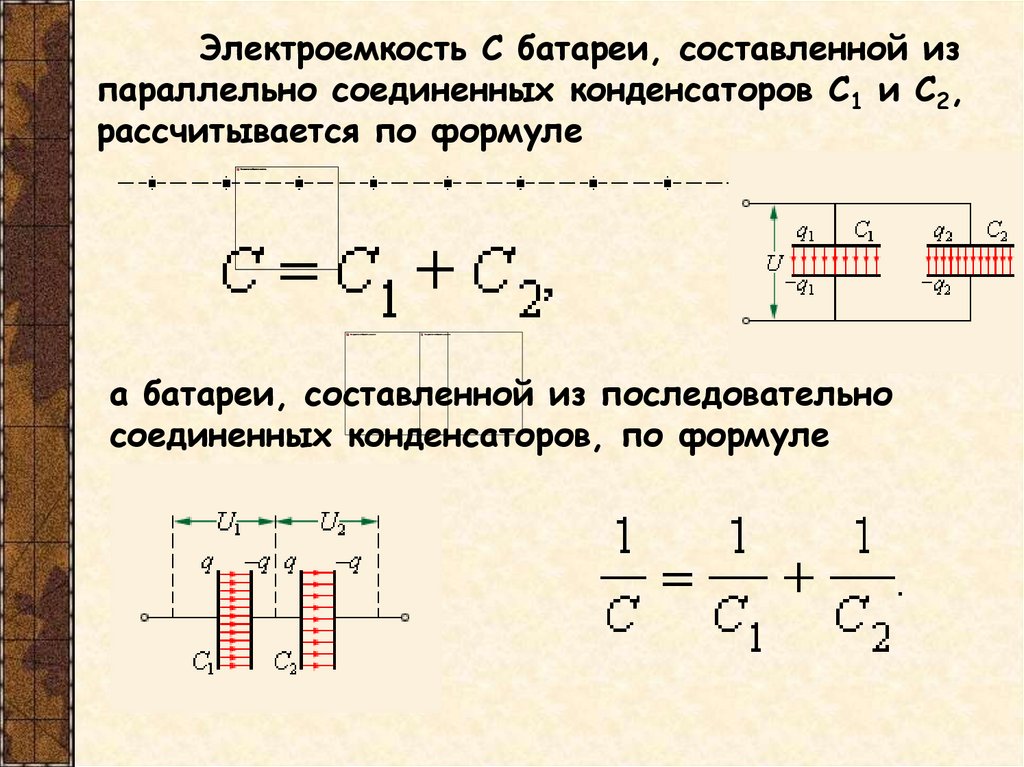Электроемкость C батареи, составленной изпараллельно соединенных конденсаторов C1 и C2,