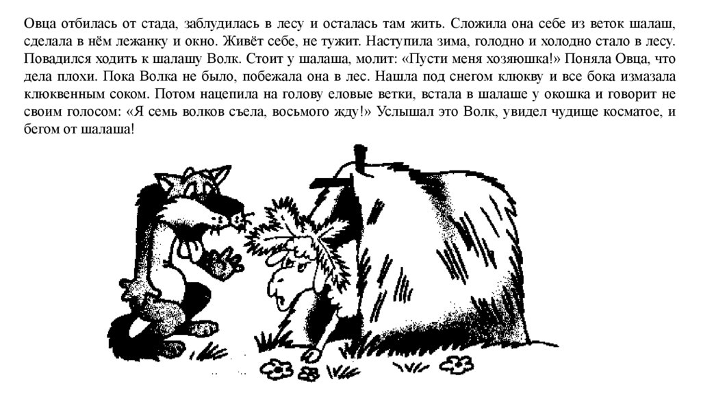 Повадился ходить к шалашу Волк. Стоит у шалаша, молит: «Пусти меня хозяюшка!» Поняла Овца, что
