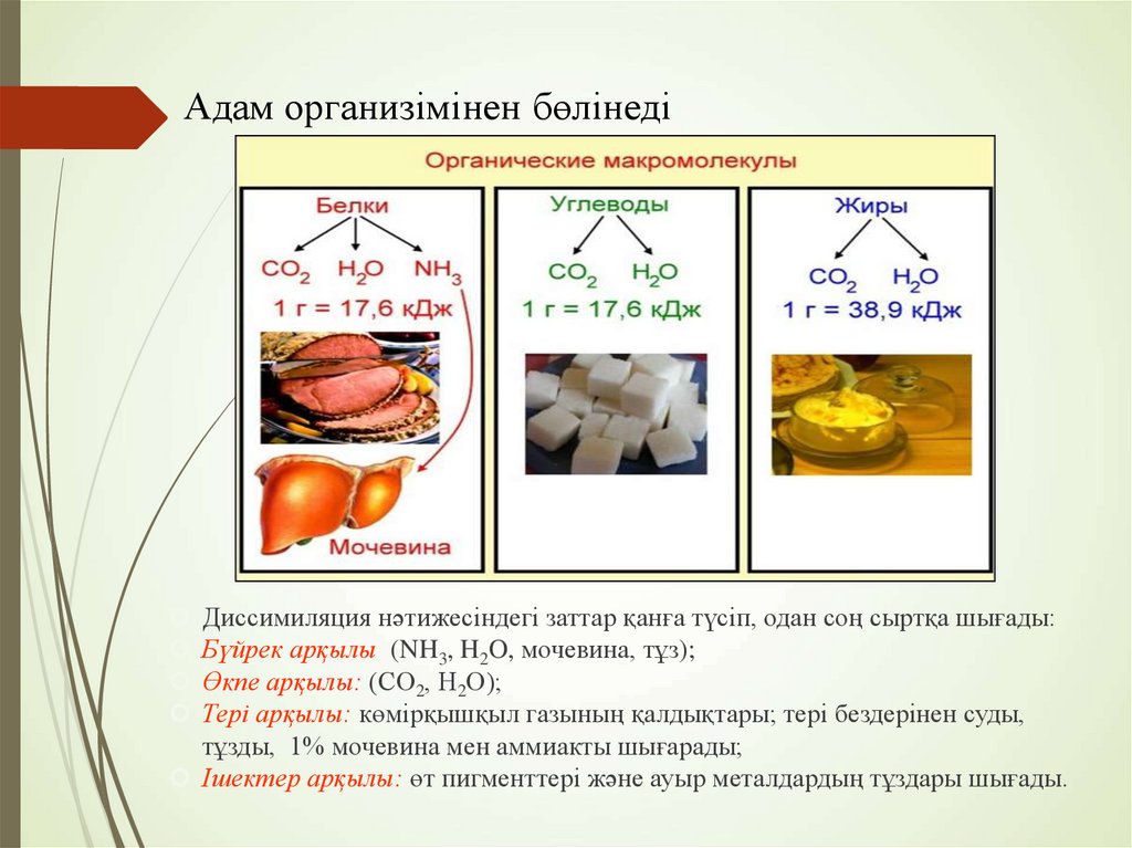 Адам организімінен бөлінедіДиссимиляция нәтижесіндегі заттар қанға түсіп, одан соң сыртқа шығады: