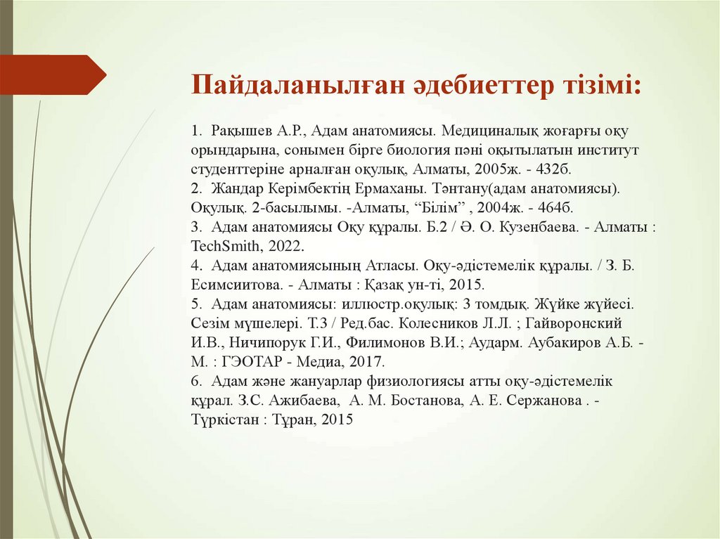Пайдаланылған әдебиеттер тізімі:1. Рақышев А.Р., Адам анатомиясы. Медициналық жоғарғы оқу
