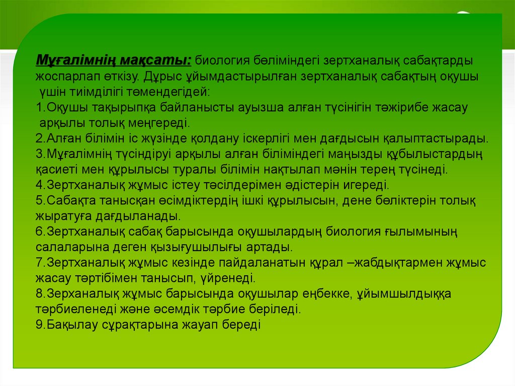 Мұғалімнің мақсаты: биология бөліміндегі зертханалық сабақтардыжоспарлап өткізу. Дұрыс ұйымдастырылған зертханалық сабақтың оқушы