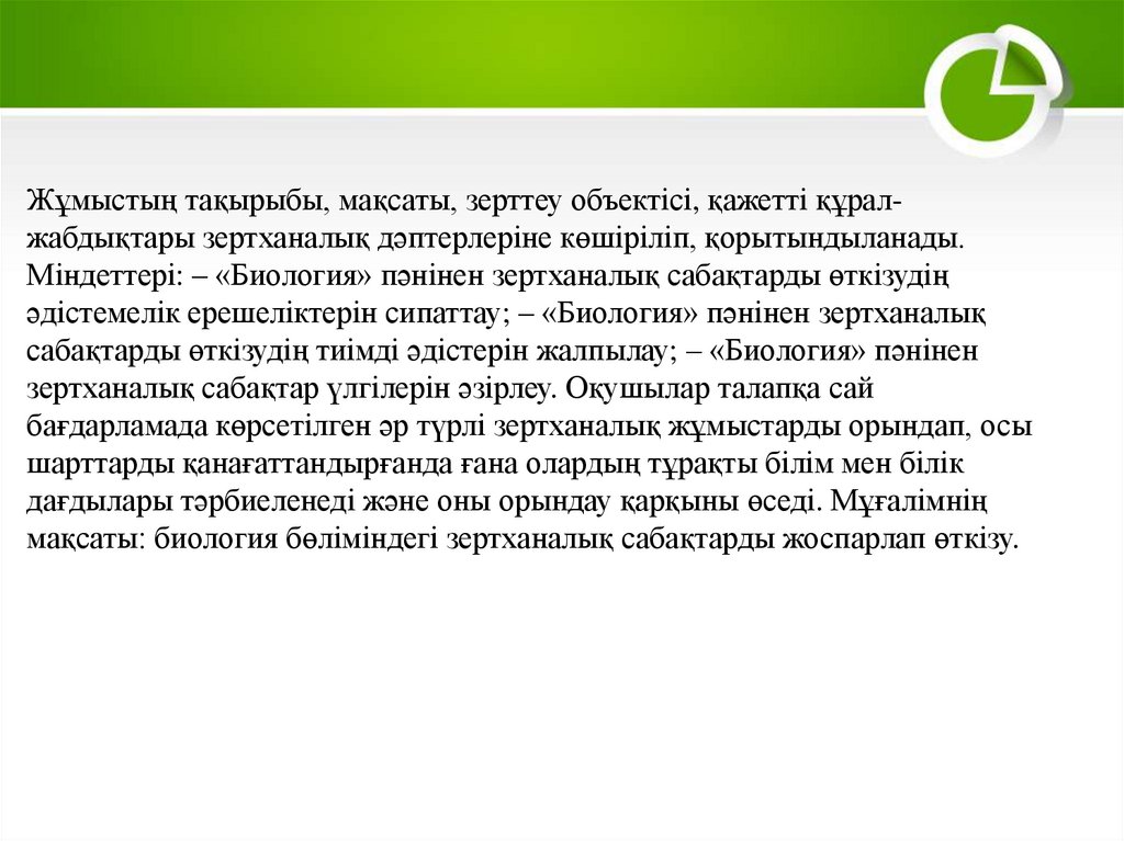Жұмыстың тақырыбы, мақсаты, зерттеу объектісі, қажетті құралжабдықтары зертханалық дәптерлеріне көшіріліп, қорытындыланады.Міндеттері: – «Биология» пәнінен зертханалық сабақтарды өткізудің