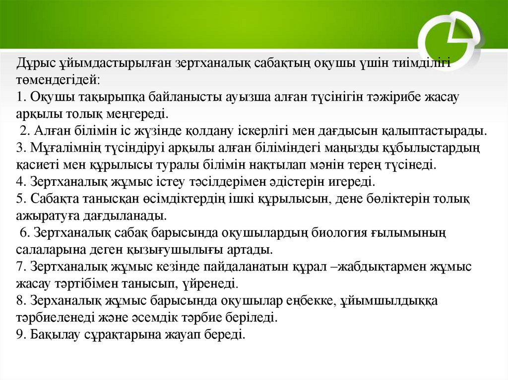 Дұрыс ұйымдастырылған зертханалық сабақтың оқушы үшін тиімділігітөмендегідей: