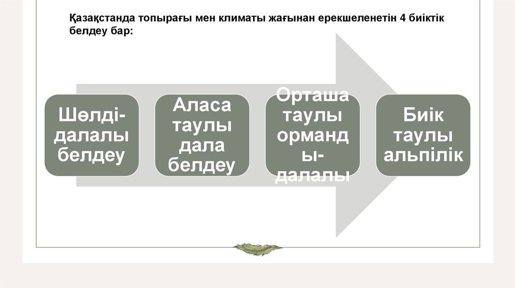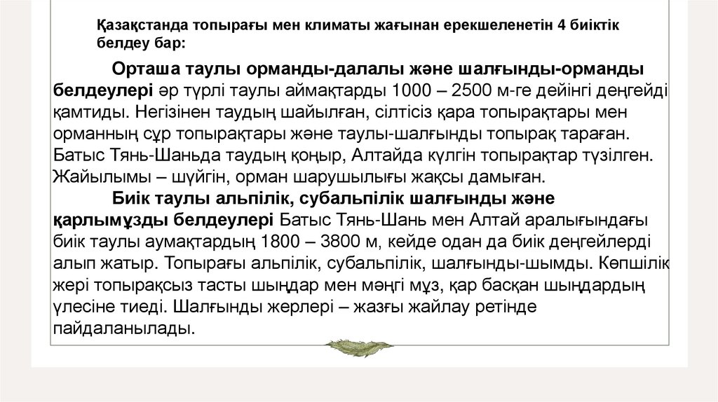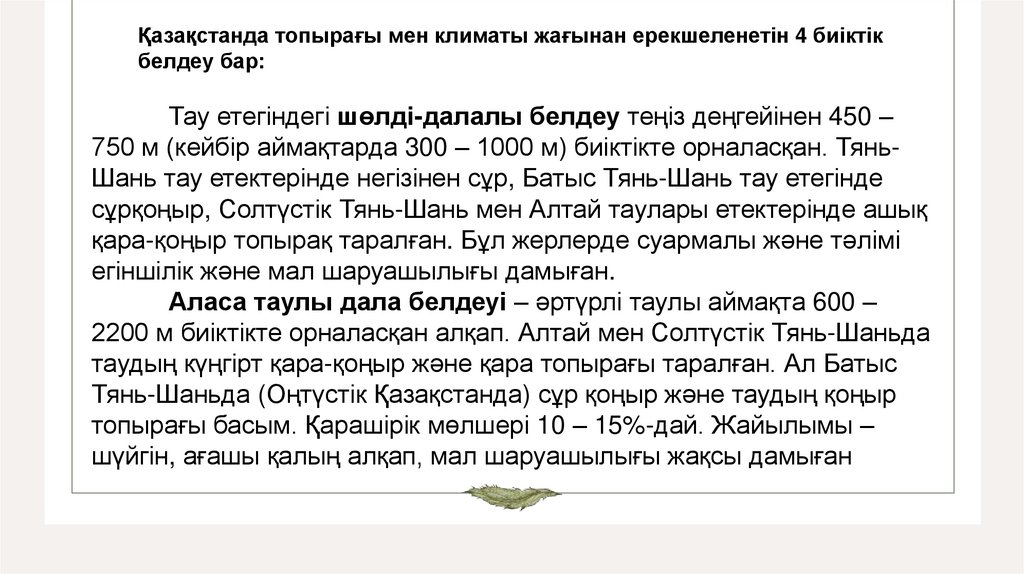 Қазақстанда топырағы мен климаты жағынан ерекшеленетін 4 биіктікбелдеу бар: