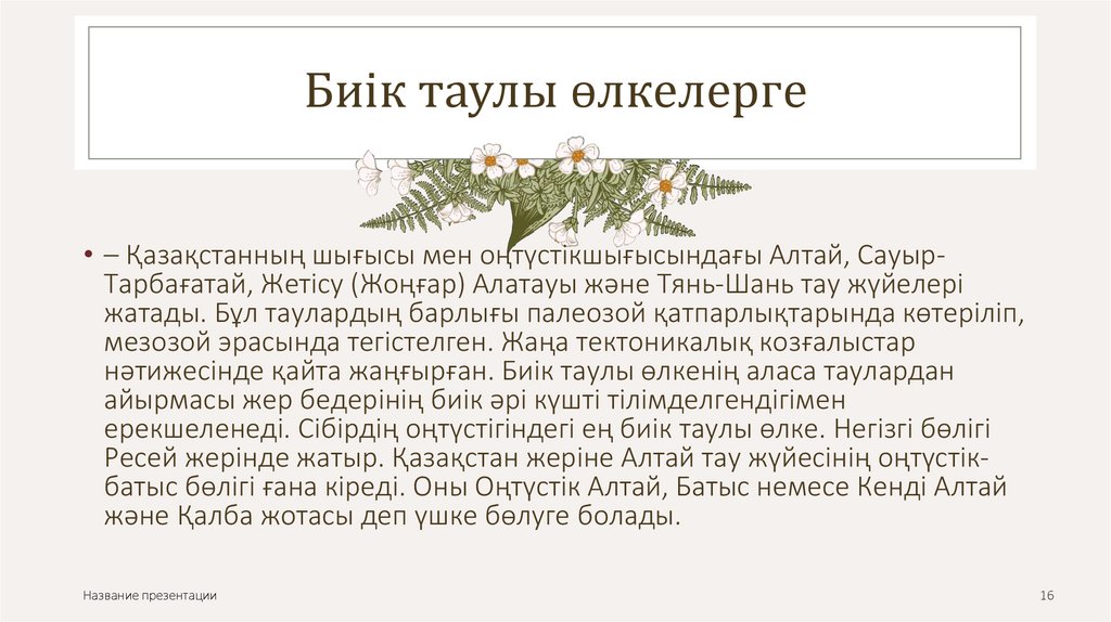 Биік таулы өлкелерге• – Қазақстанның шығысы мен оңтүстікшығысындағы Алтай, СауырТарбағатай, Жетісу (Жоңғар) Алатауы жəне Тянь-Шань тау жүйелері