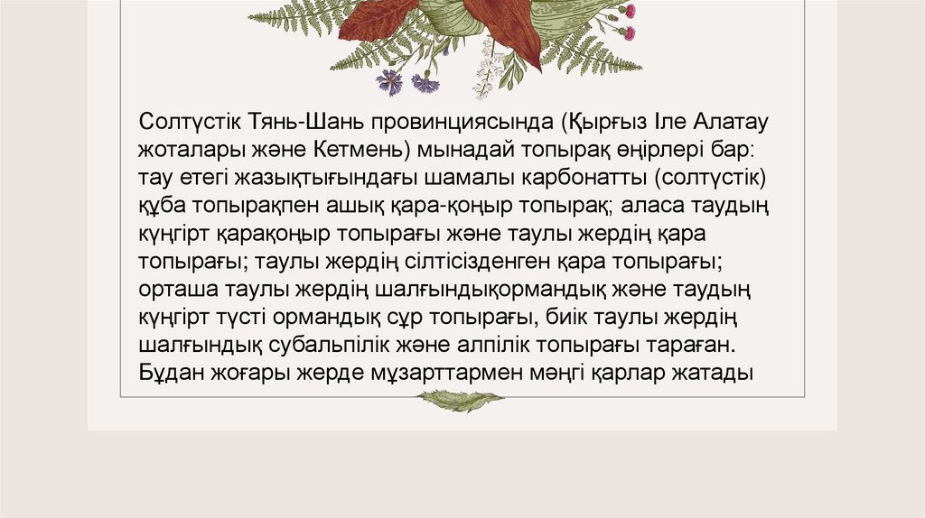 қамтиды. Негізінен таудың шайылған, сілтісіз қара топырақтары мен